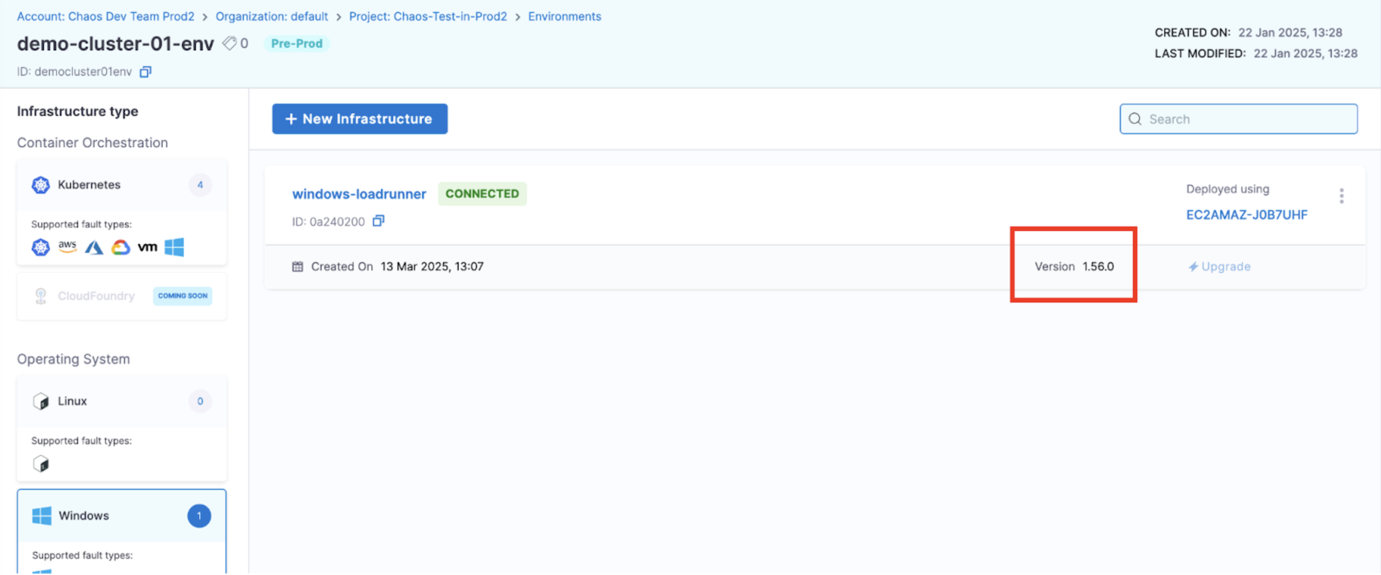 Go to Chaos > Environments, and select an environment where you've installed chaos infrastructure. Select the infrastructure and you will see the infrastructure version. If an upgrade is required, Upgrade Now is specified next to the infrastructure.