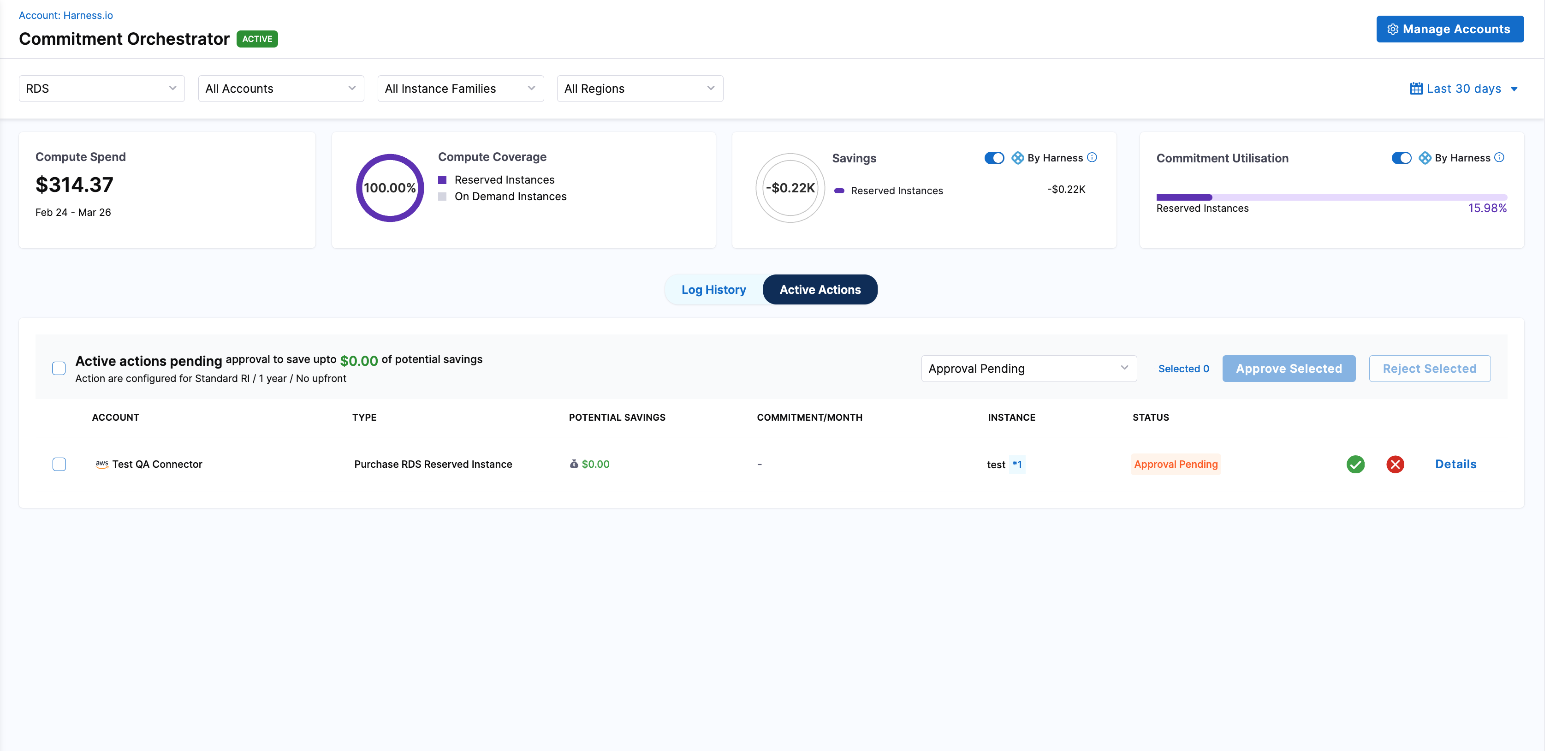 The Active Actions feature enables users to review and manage recommendations generated by the Commitment Orchestrator. You can view all recommendations categorized by day and type, then approve or reject them individually, in subsets, or all at once across different master accounts and regions.