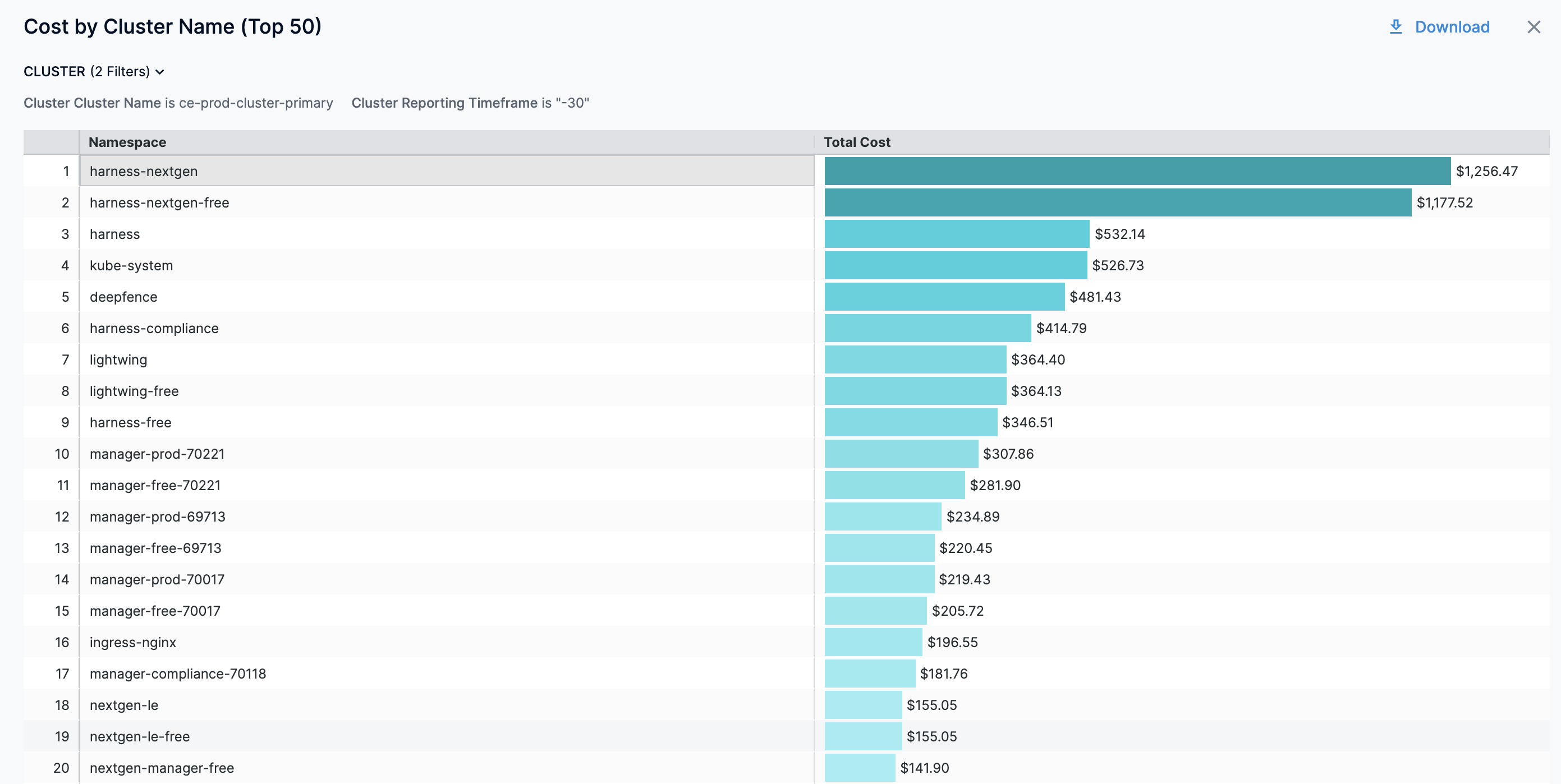8. You can further drill down and view the cloud cost of a specific Namespace. For example, drill into harness-nextgen and view the cost by Workload Name.
