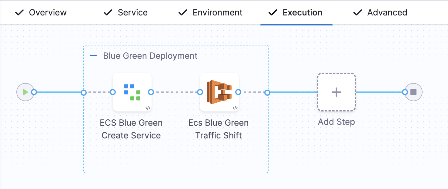 Your Execution tab now includes a Blue Green Deployment step group with the ECS Blue Green Create Service step and ECS Blue-Green Traffic Shifting step.