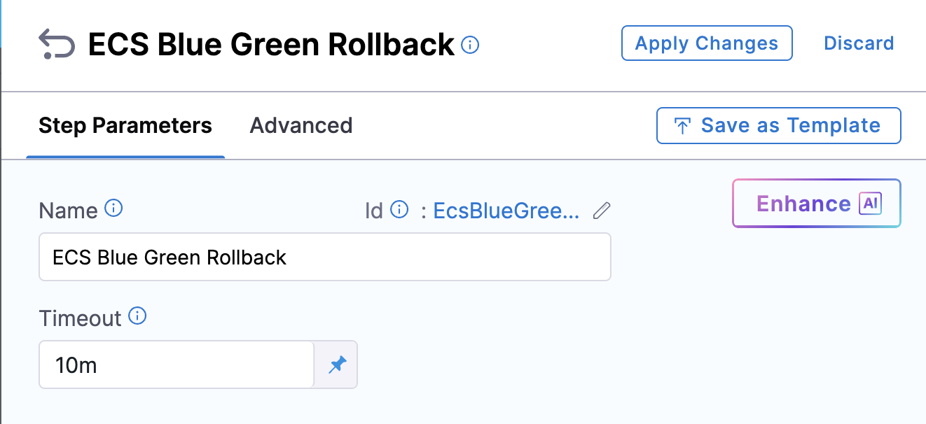 • In Inherit mode, if the step fails mid-execution, the rollback is handled by the ECS Blue Green Rollback step, which restores the traffic weights and blue/green tag assignments using the stored rollback data.