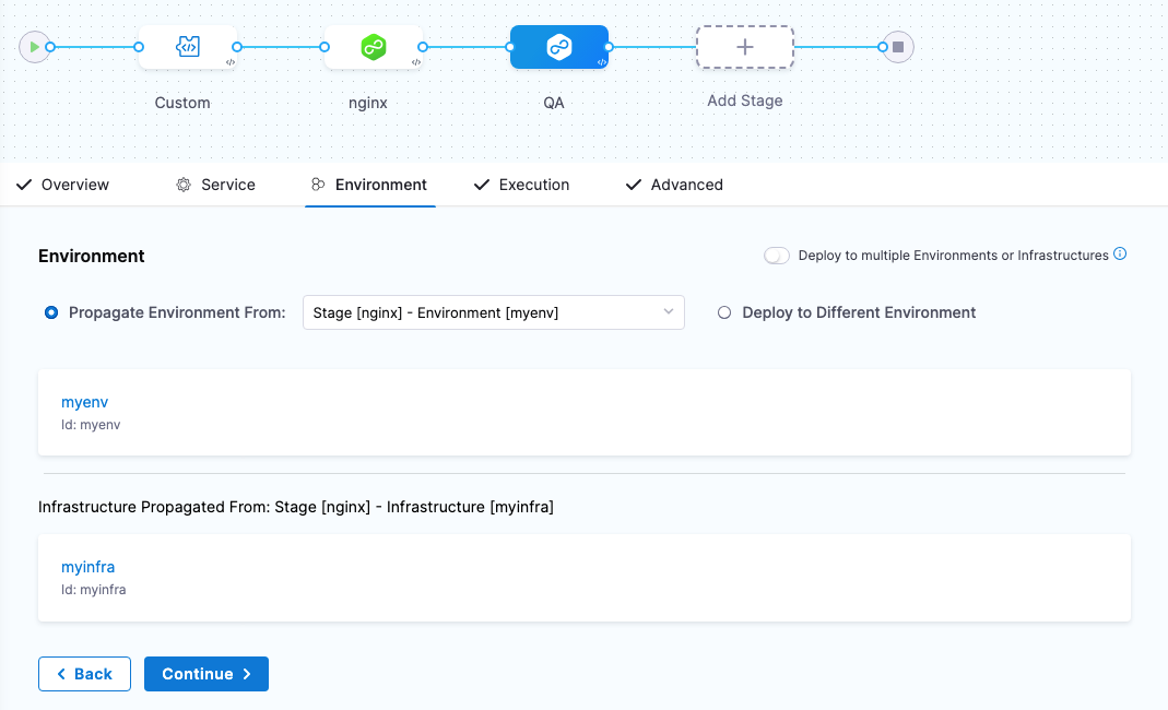 When modeling multiple Deploy stages in a pipeline, you can propagate the environment and infrastructure definition selected in one stage to one or more subsequent stages.