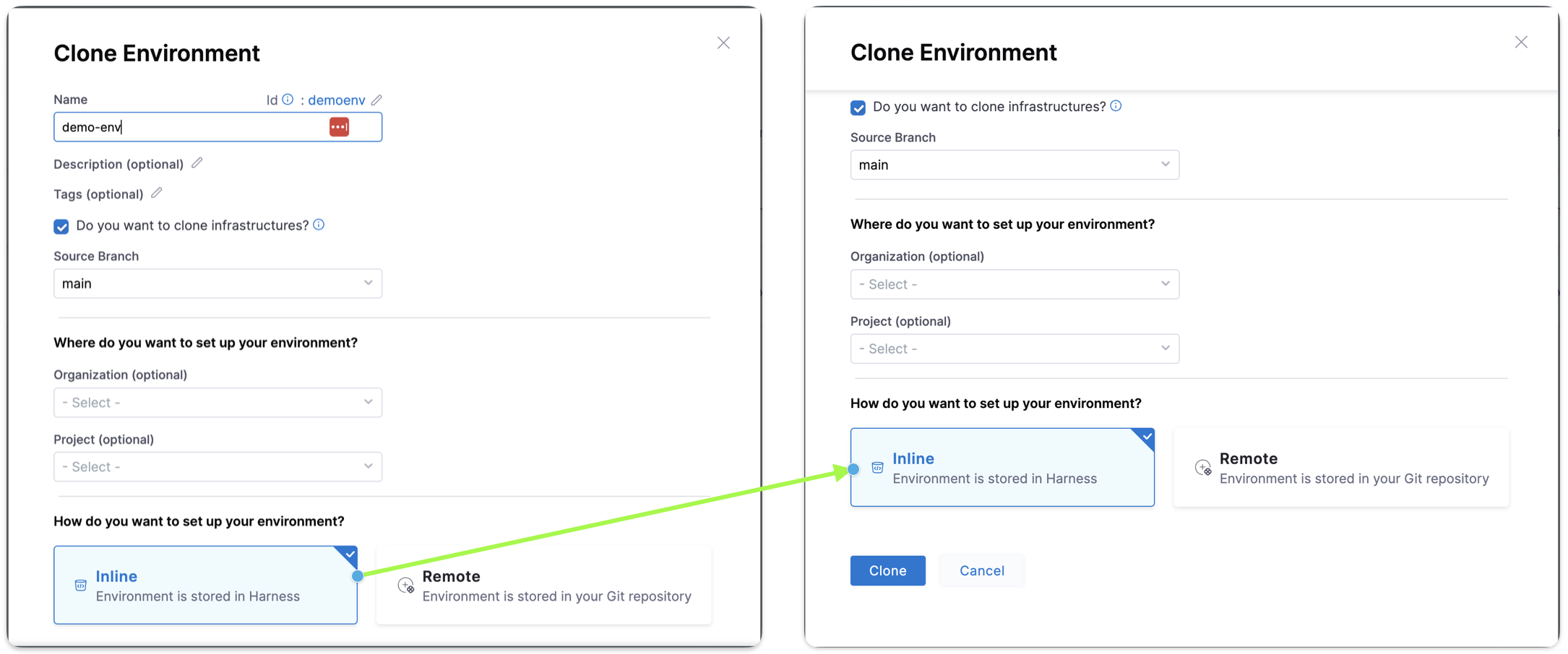 You can modify the destination of your clone environment using the Organization and Project fields.