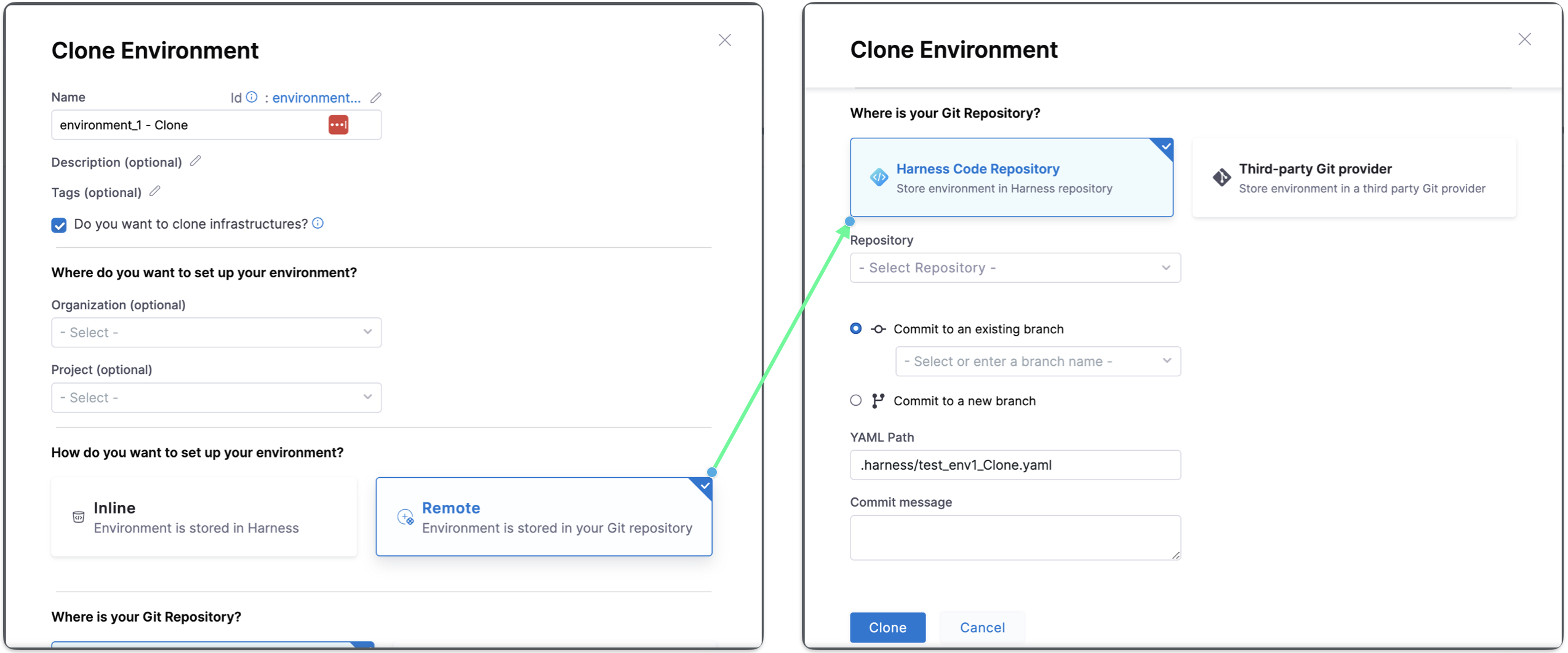 To clone an inline environment or remote environment to a remote environment, you must specify the target repository, Harness Code Repository, to store the environment in the Harness repository or Third-party Git provider, to store the environment in a third party Git provider, define the Git Connector if Third-party Git provider. Specify the Repository name, the YAML path, and the commit message.
