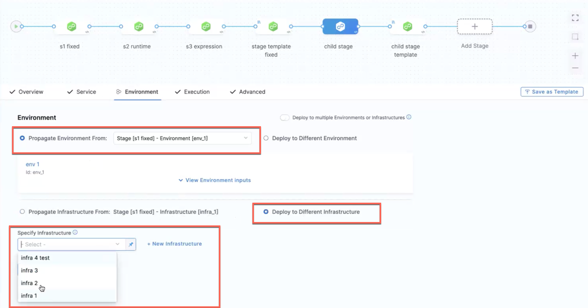 When you propagate an environment, you can either use the same infrastructure definition that was used in the parent stage or you can select a different infrastructure definition.