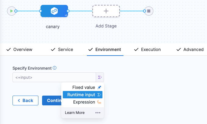 • In a pipeline's Advanced Options, in Stage Execution Settings, you can set up selective stage executions. This allows you to select which stages to deploy at runtime.