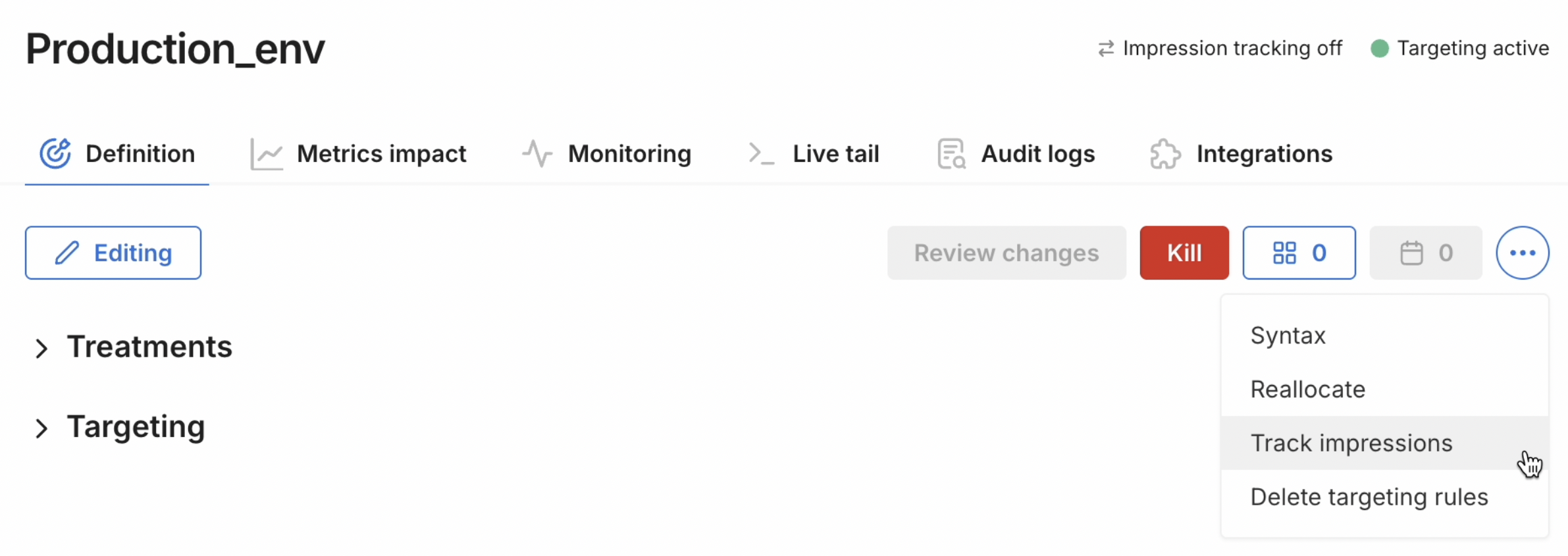 1. Click the ellipses menu on a feature flag Definition tab, and select the Track impressions menu item.