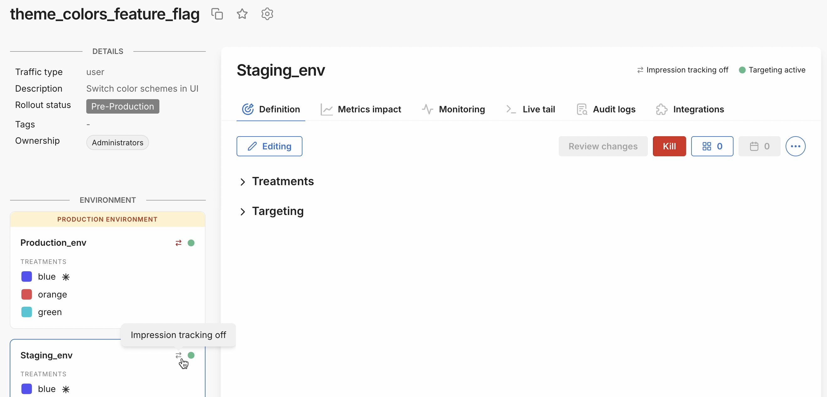 Feature flag definitions (including the Track impressions on/off setting) are environment-specific. This means you can turn impressions off for a flag in one environment, but continue tracking impressions for the flag in another environment.