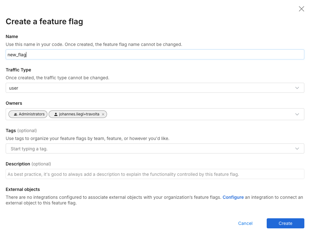 External objects. Optionally associate a feature flag with one or more external objects, if a compatible integration is configured. Examples of integrations include Jira and Azure DevOps.