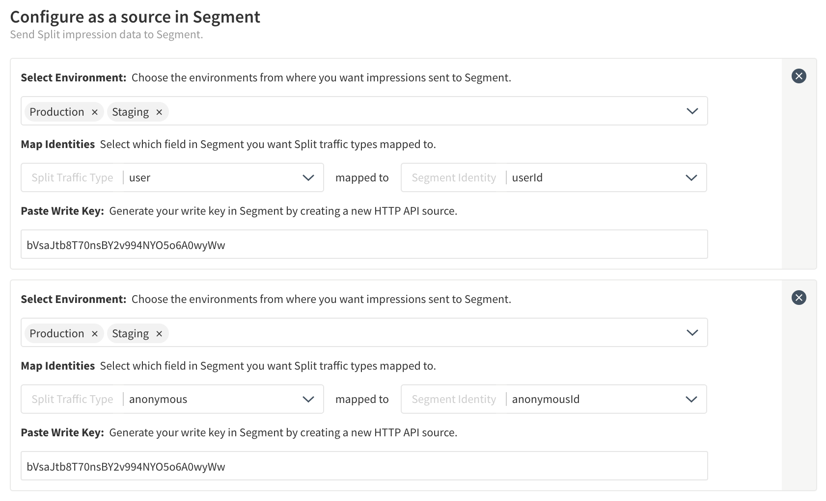 If you have different Harness FME environments that correspond to different Segment workspaces, you can click Add configuration to configure the integration to send with a different write key.