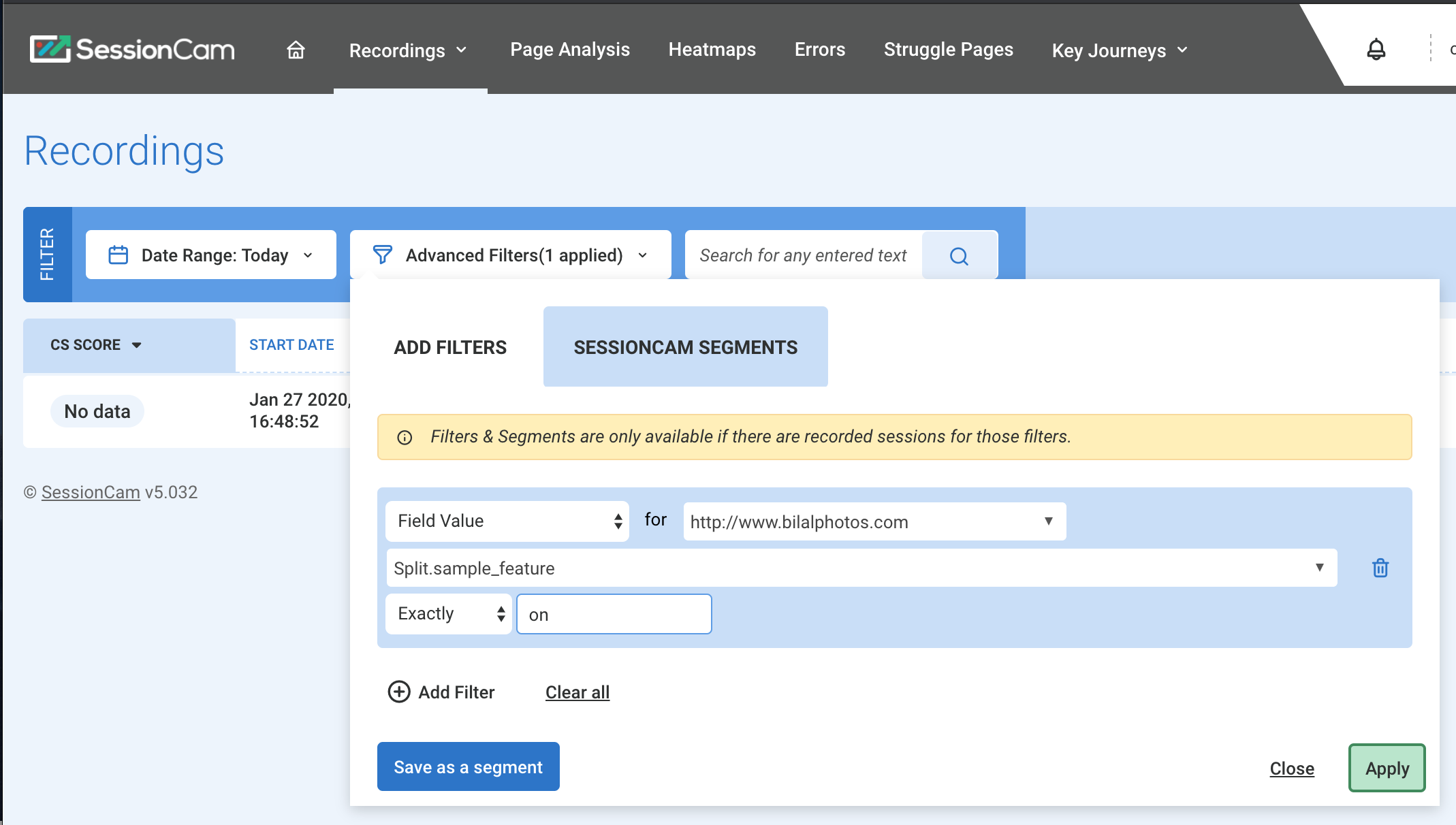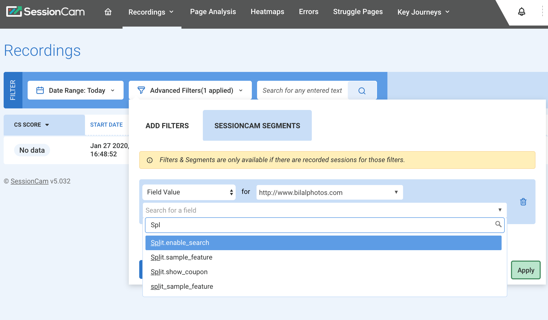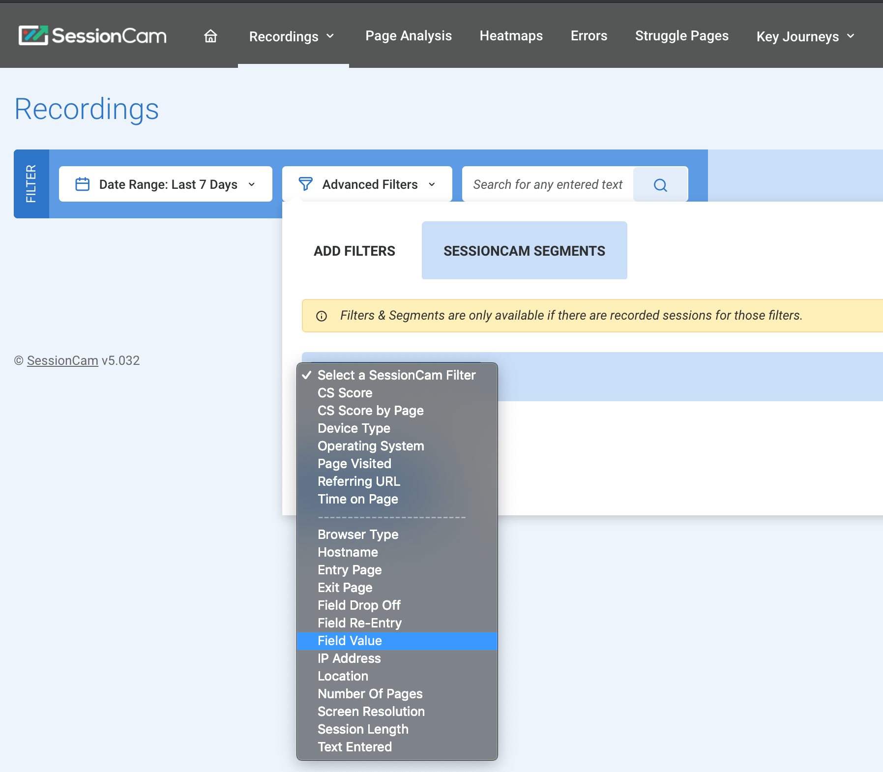 To view the correlated sessions in SessionCam, use the Advanced filter: