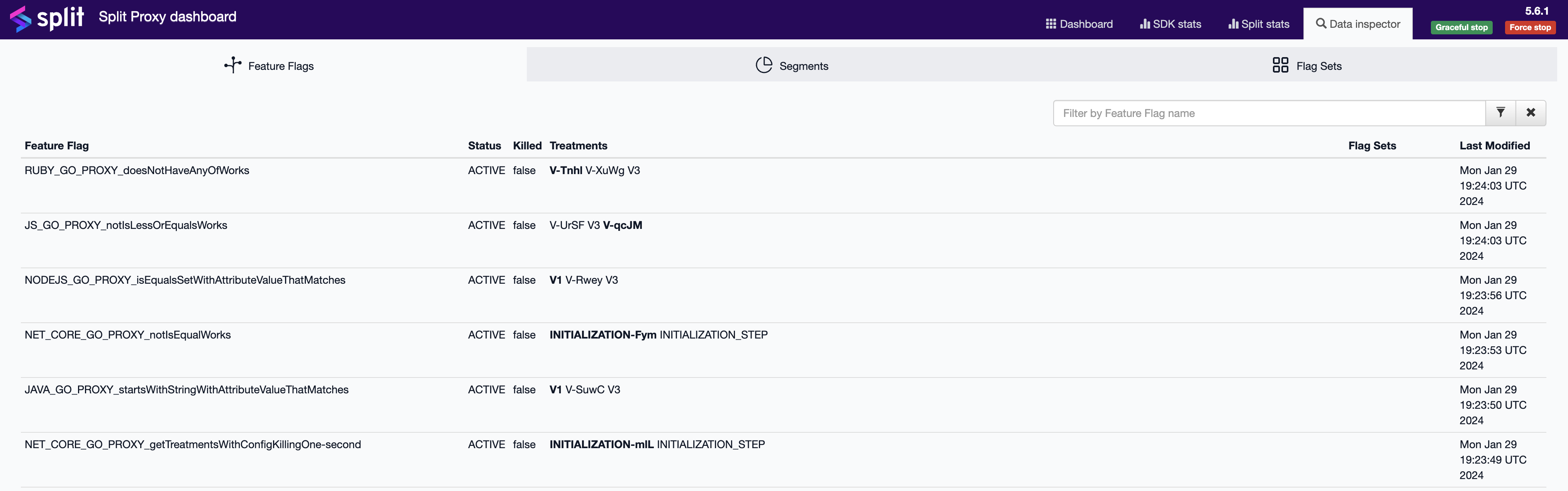 • Data inspector: Cached data showing feature flags and segments; filters to find keys and feature flag definitions