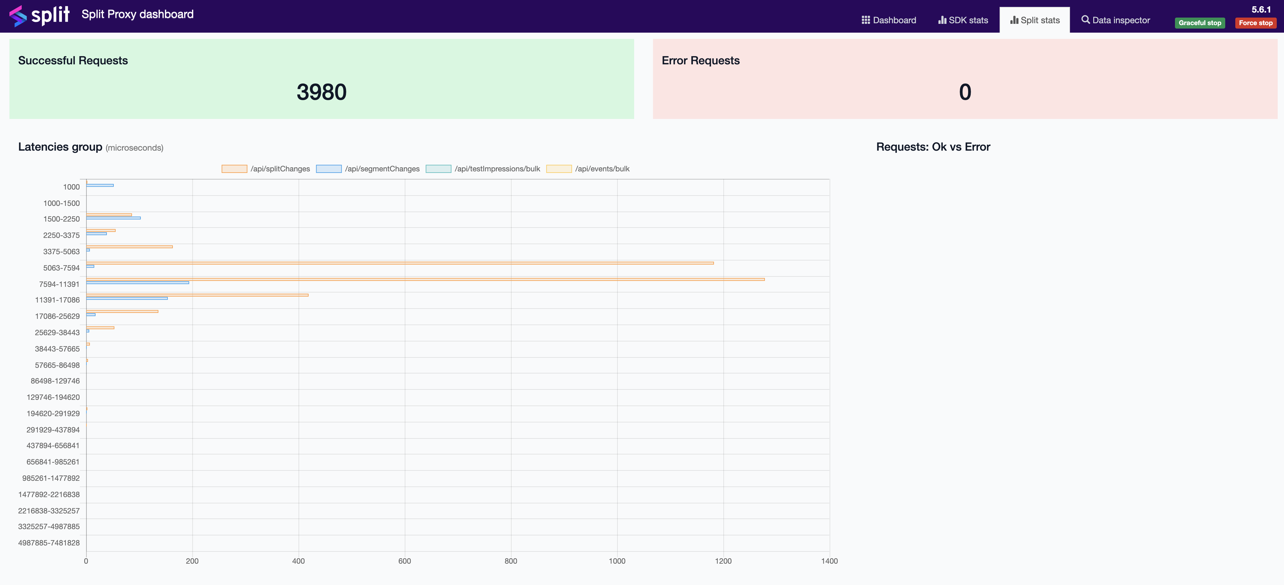 • Split stats: Metrics numbers and a latency graph, measured between proxy requests integration with Harness servers