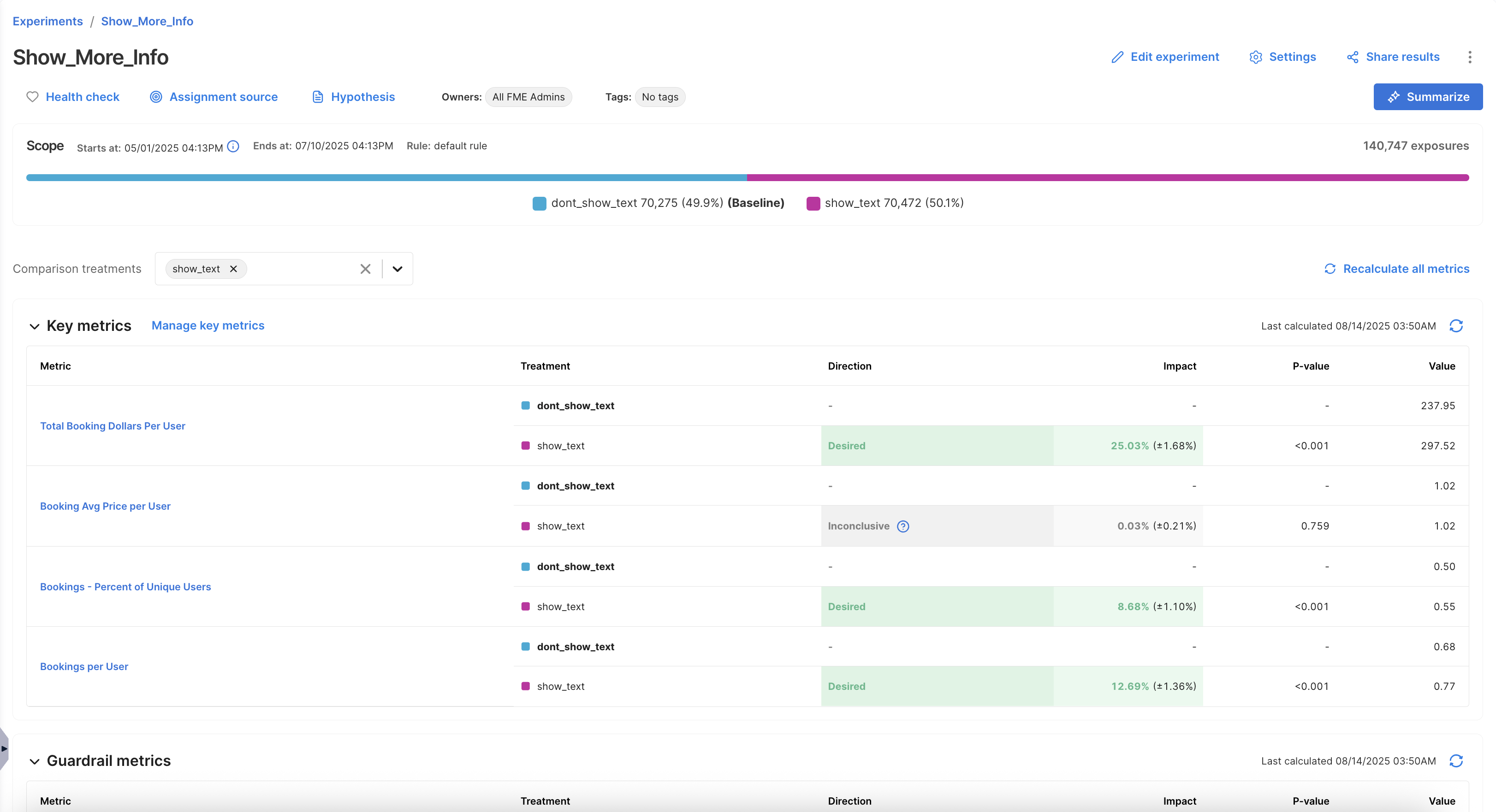 Drill down into experiment details to validate setup, confirm metric source alignment, and investigate user or account-level behavior.