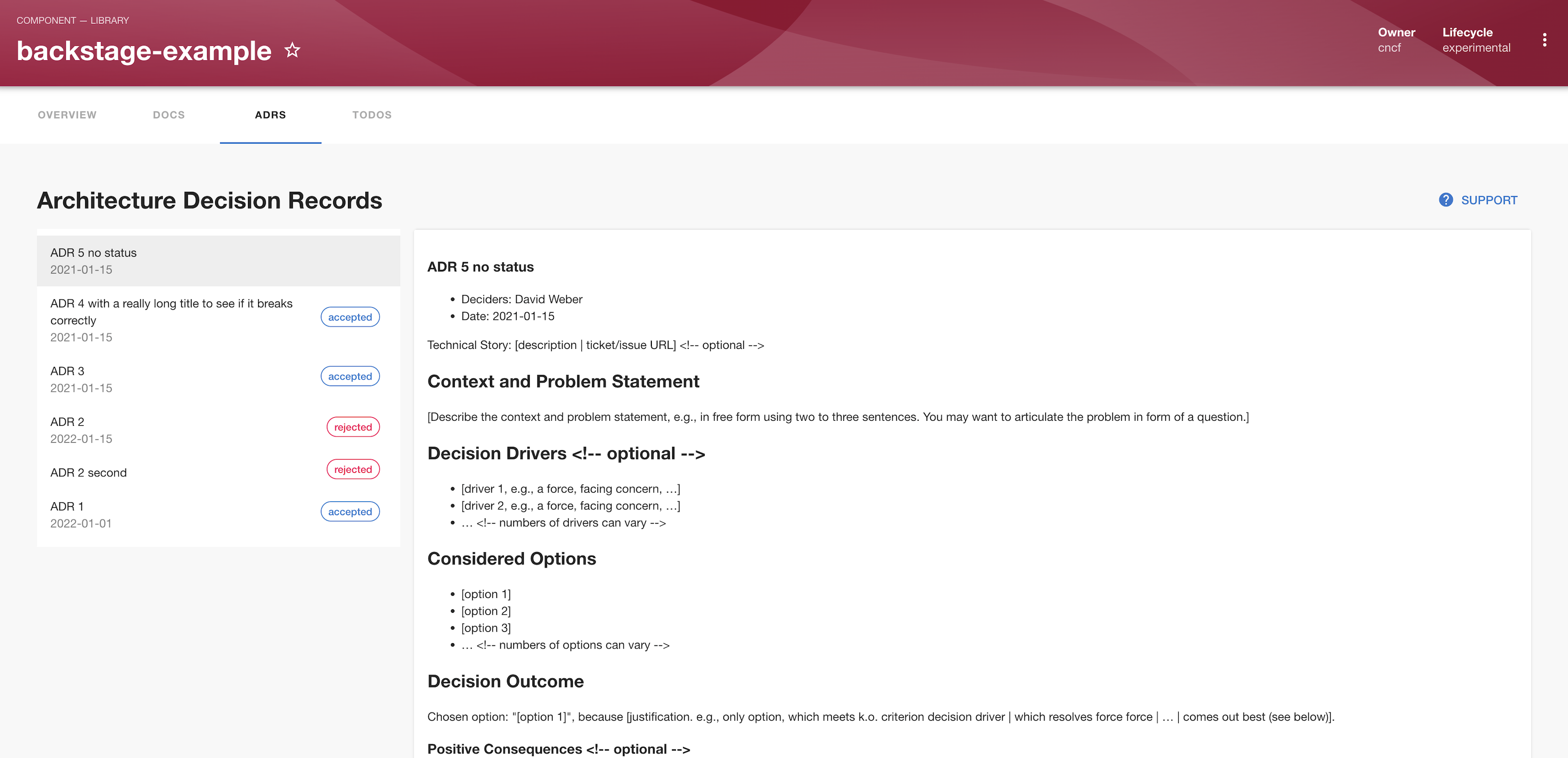For example, if you have the following directory structure, you would set backstage.io/adr-location: docs/adrs: