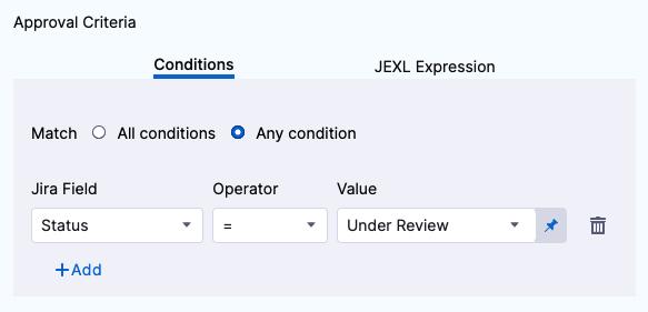 In Conditions, you simply use the Jira Field, Operator, and Value to define approval criteria. Four supported operators are =, !=, in, and not in.