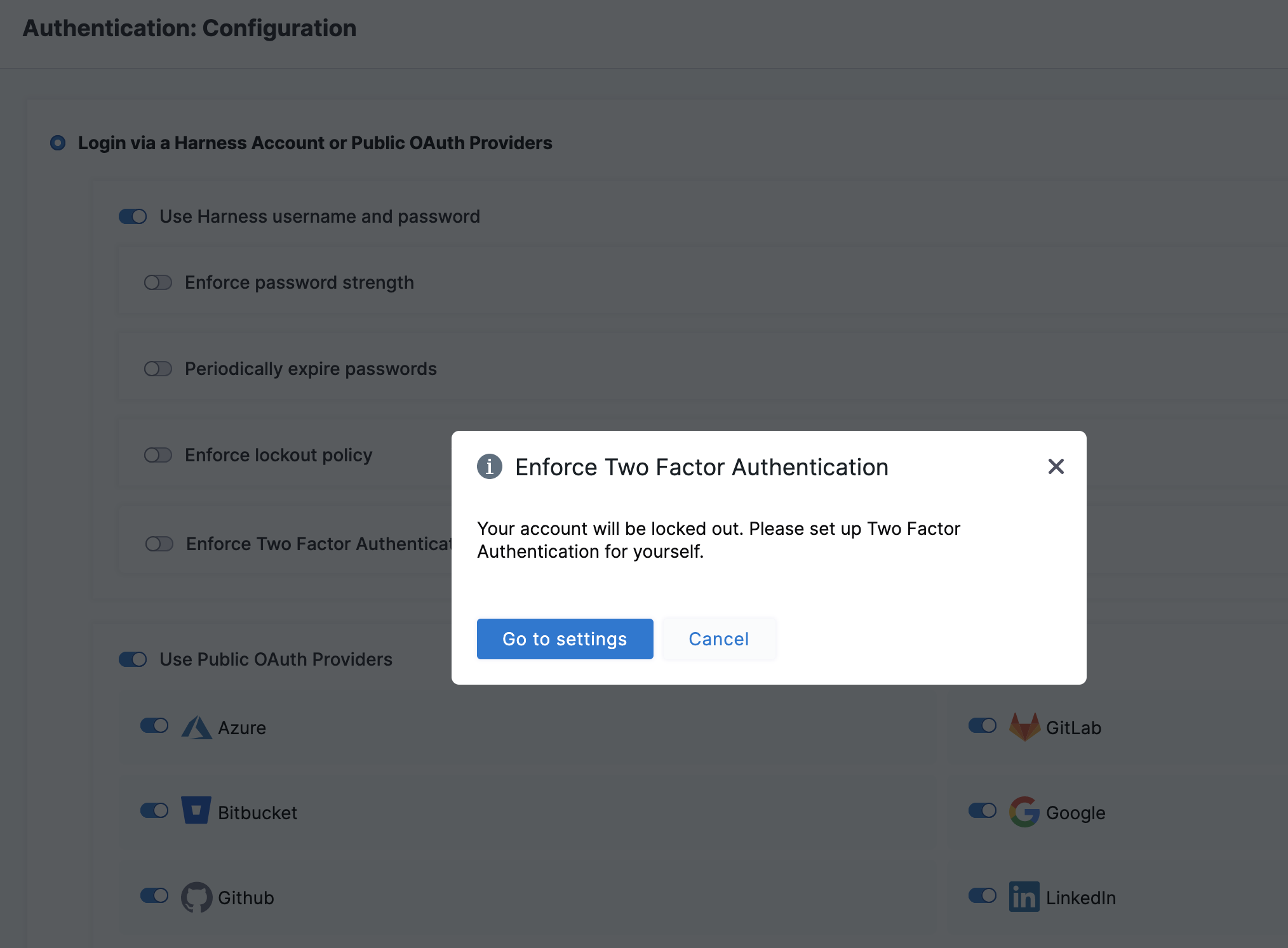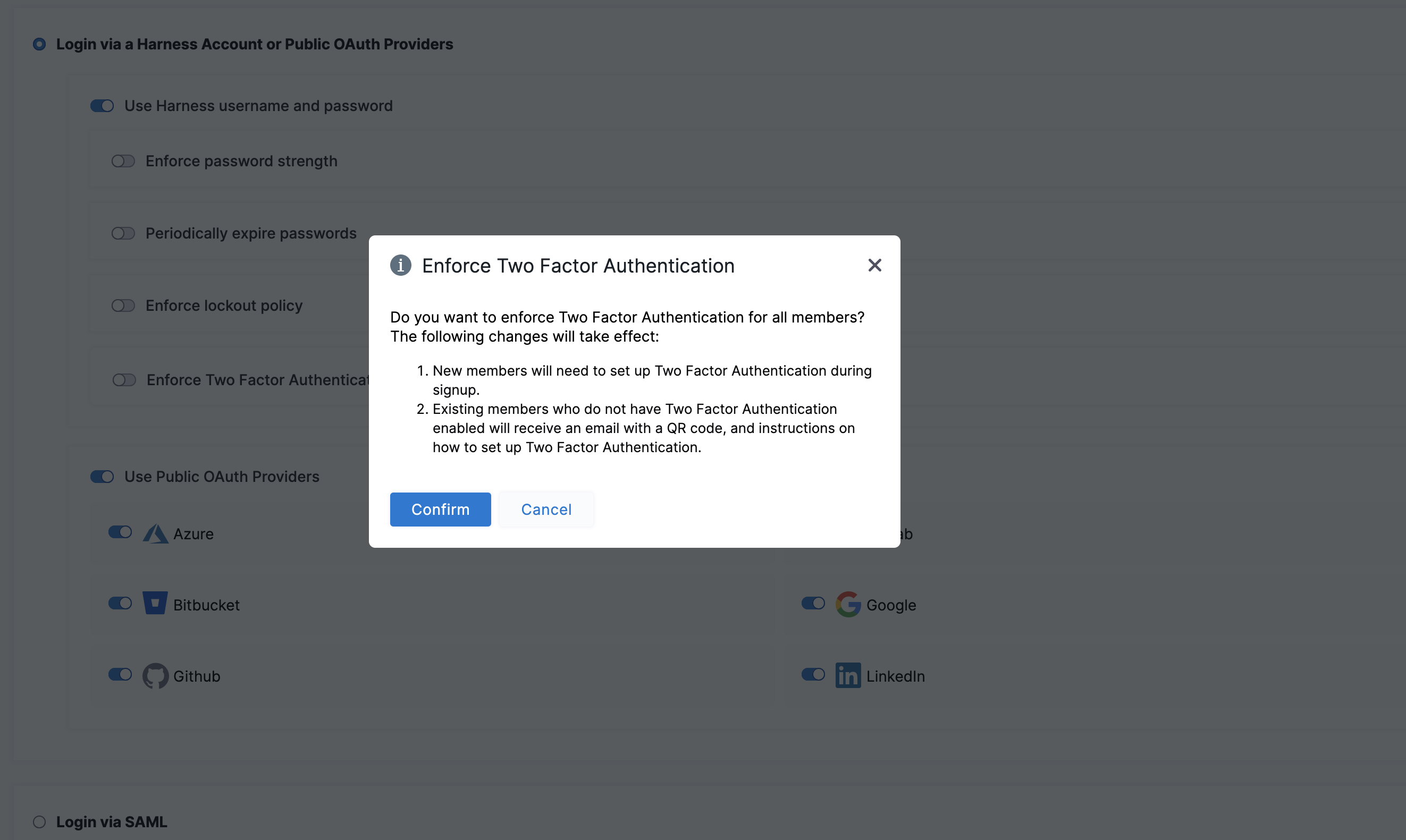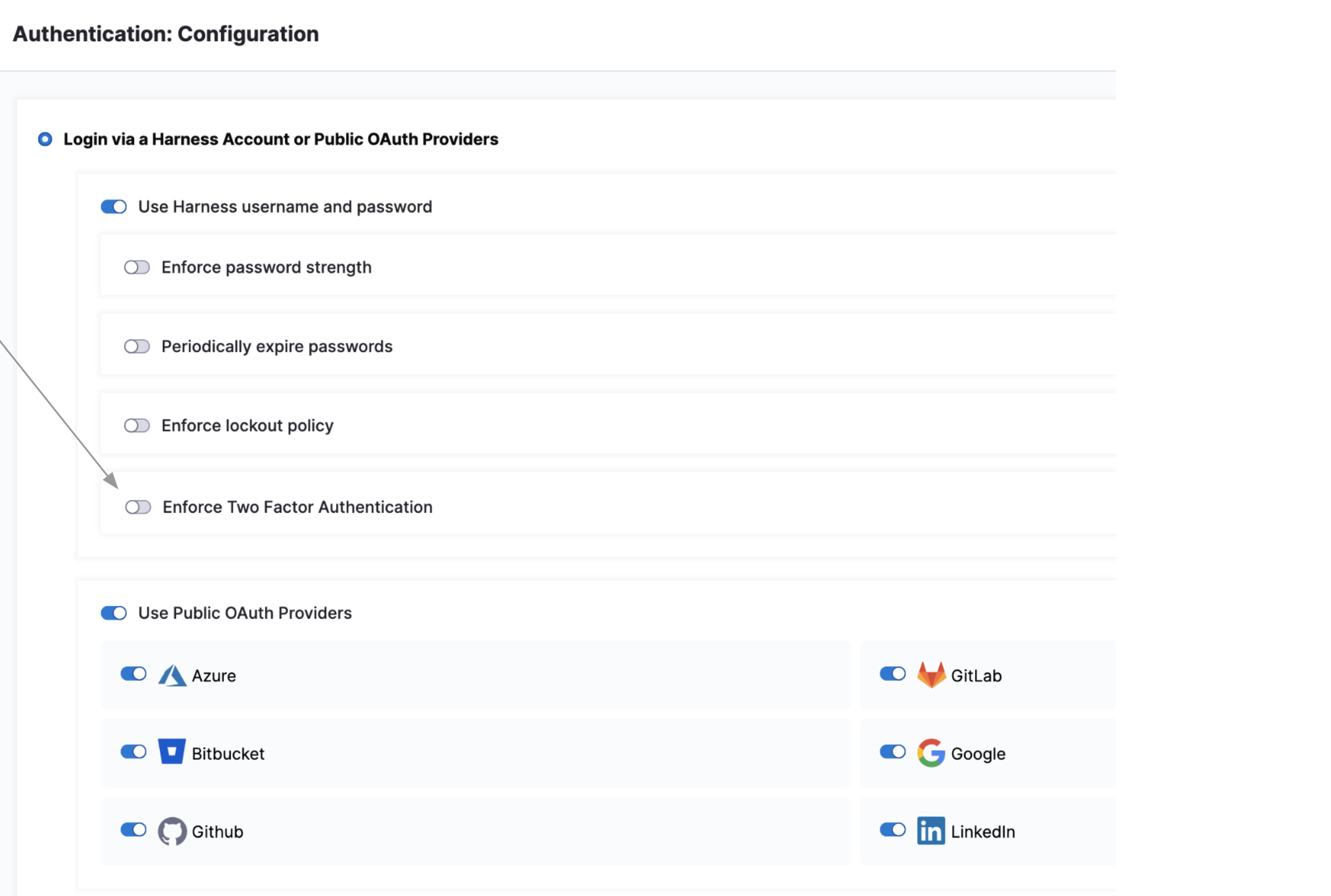 • All account users: if you have Create/Edit permissions for Authentication Settings, you can enforce 2FA for all users in Harness. First, you set up 2FA for your own account, and then you can enforce 2FA account-wide in the Harness account's Login Settings.