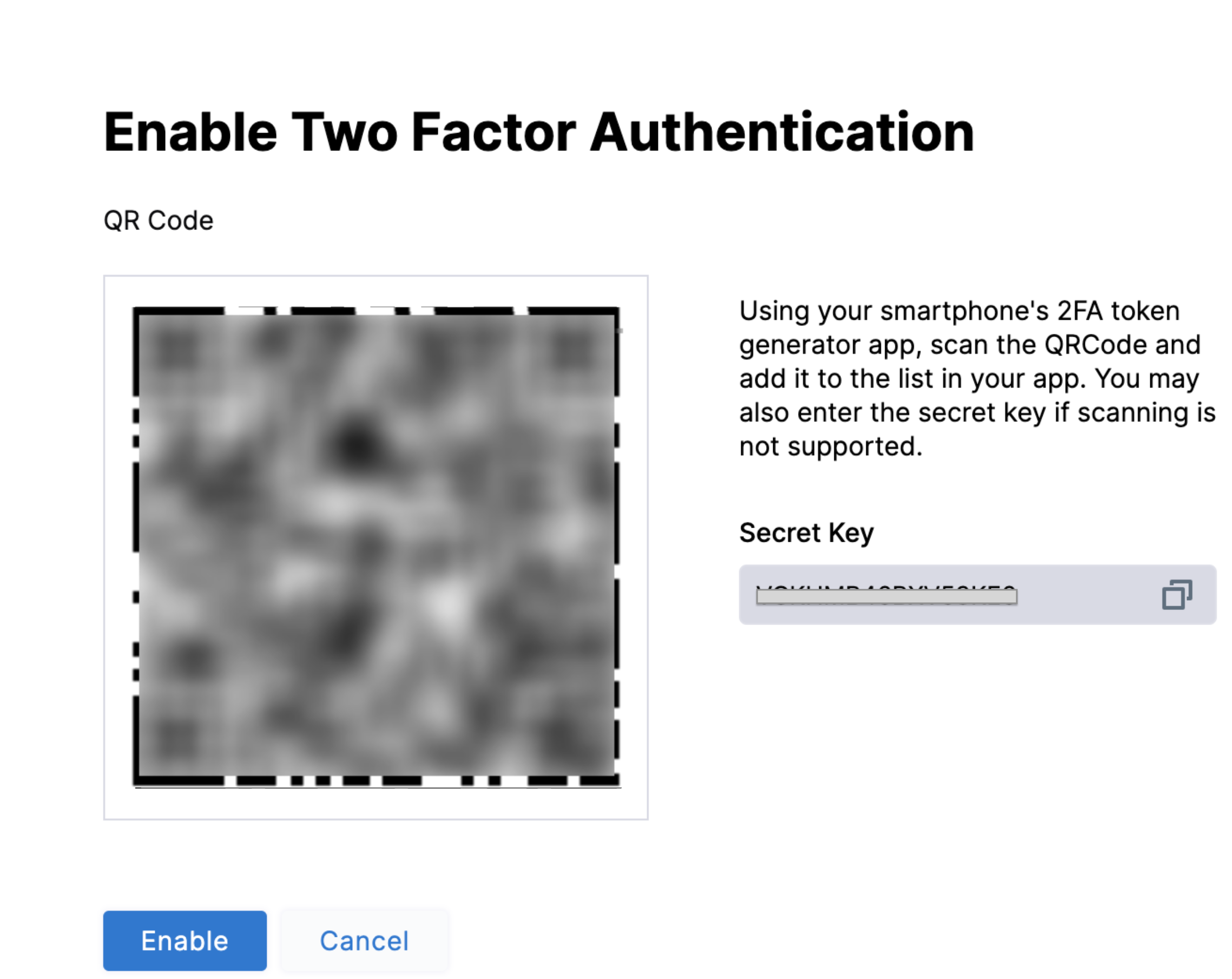 5. Select Enable. The next time you log in by entering your username and password, you are prompted to provide the 2FA authentication code.