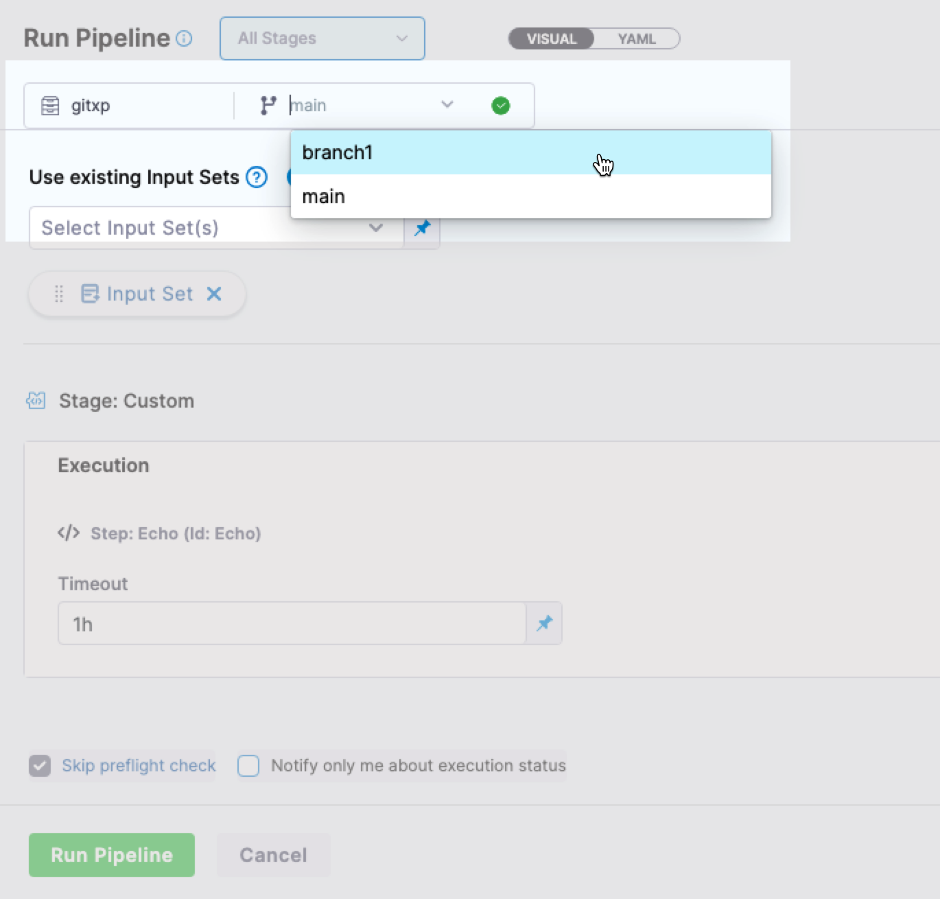 • If the referenced entities exist in the same repo, they are fetched from the same branch that you have selected for pipeline execution.