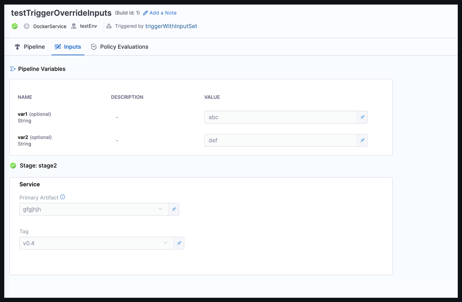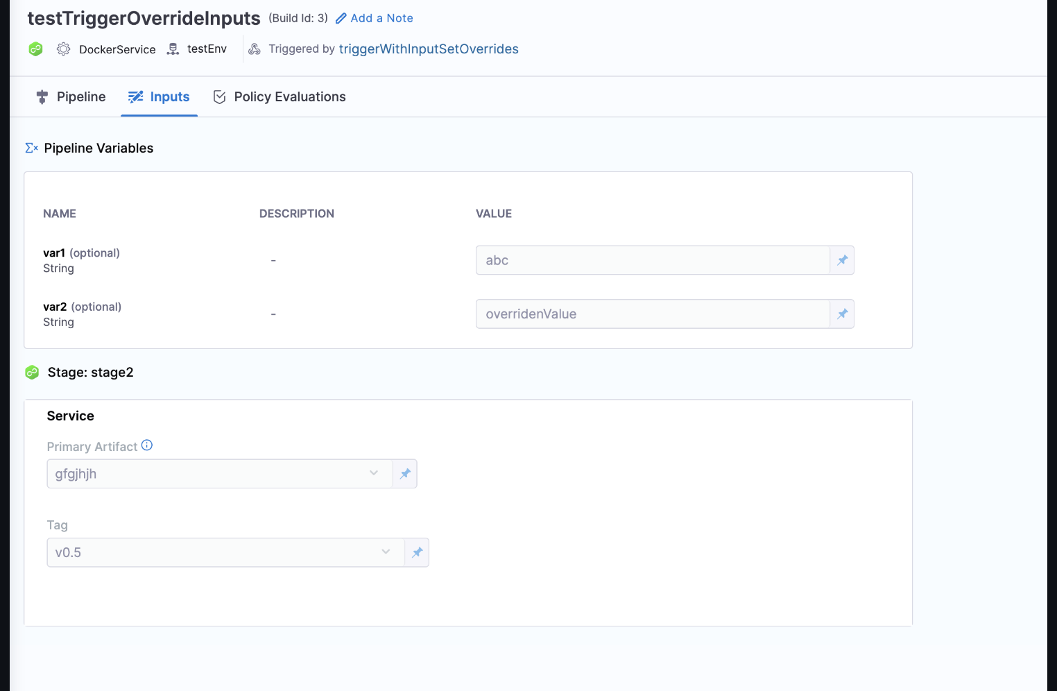 We observe that the artifact tag and var2 are coming from the override inputs. var1 is still coming from the input set, since we didn't override it in the trigger's YAML.