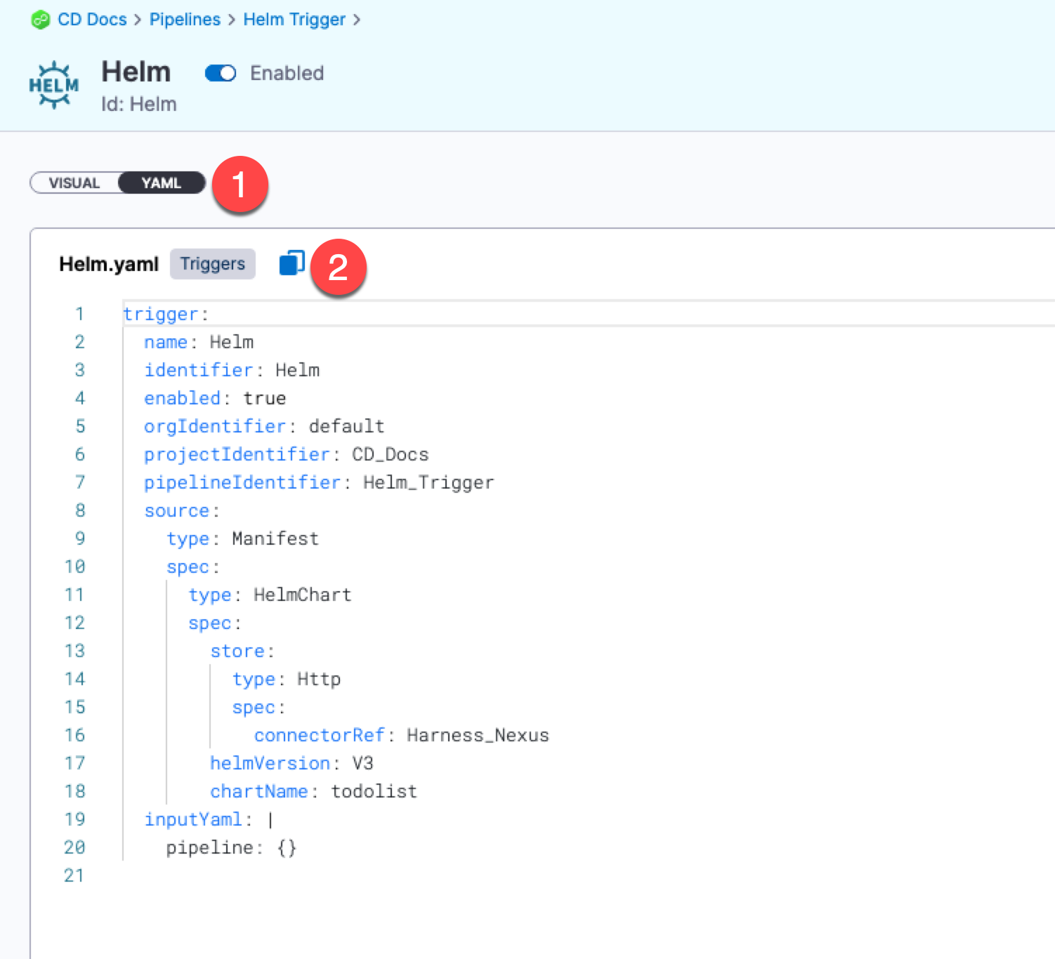 • Use the expression <+trigger.manifest.version> to have the new chart version that initiated the Trigger passed in as the version to deploy.