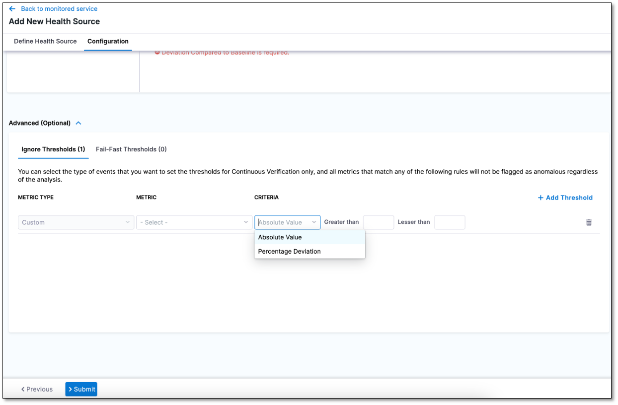 While setting up the threshold-compatible health source within a monitored service, navigate to the Advanced (Optional) section.