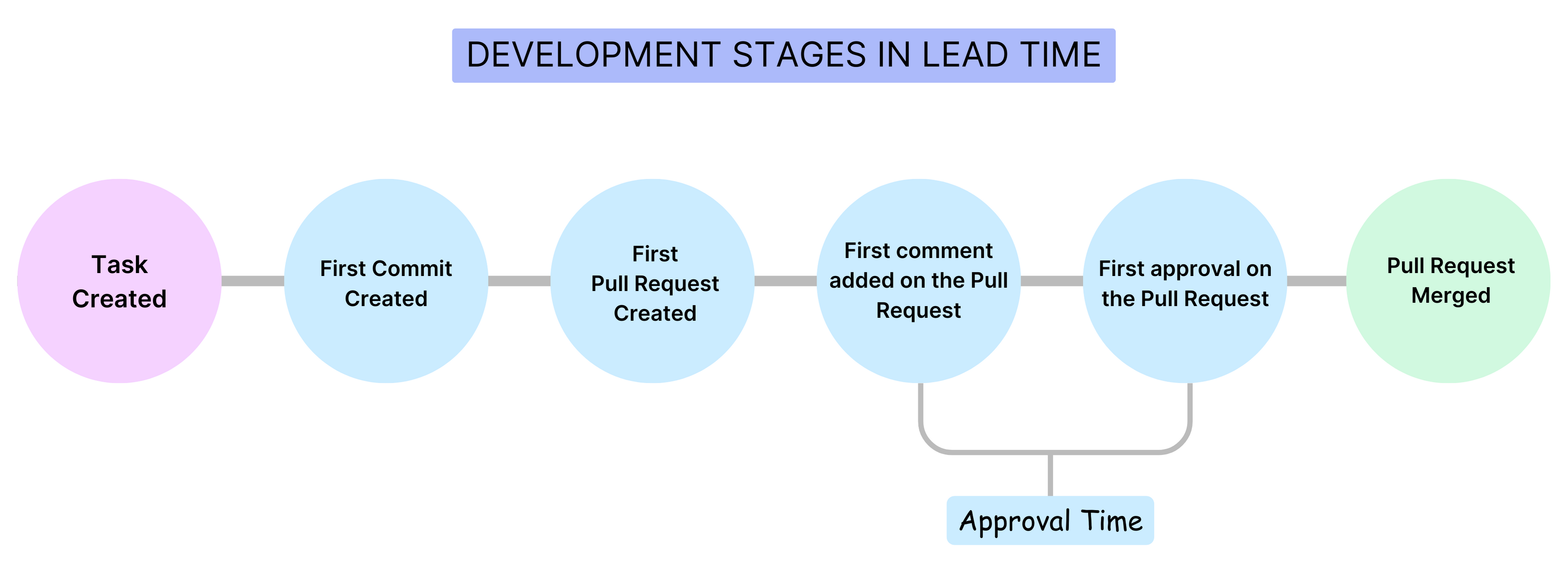 This measures the time taken from the creation of a pull request to its first approval. It's a gauge of how quickly a PR is reviewed and approved by the team.
